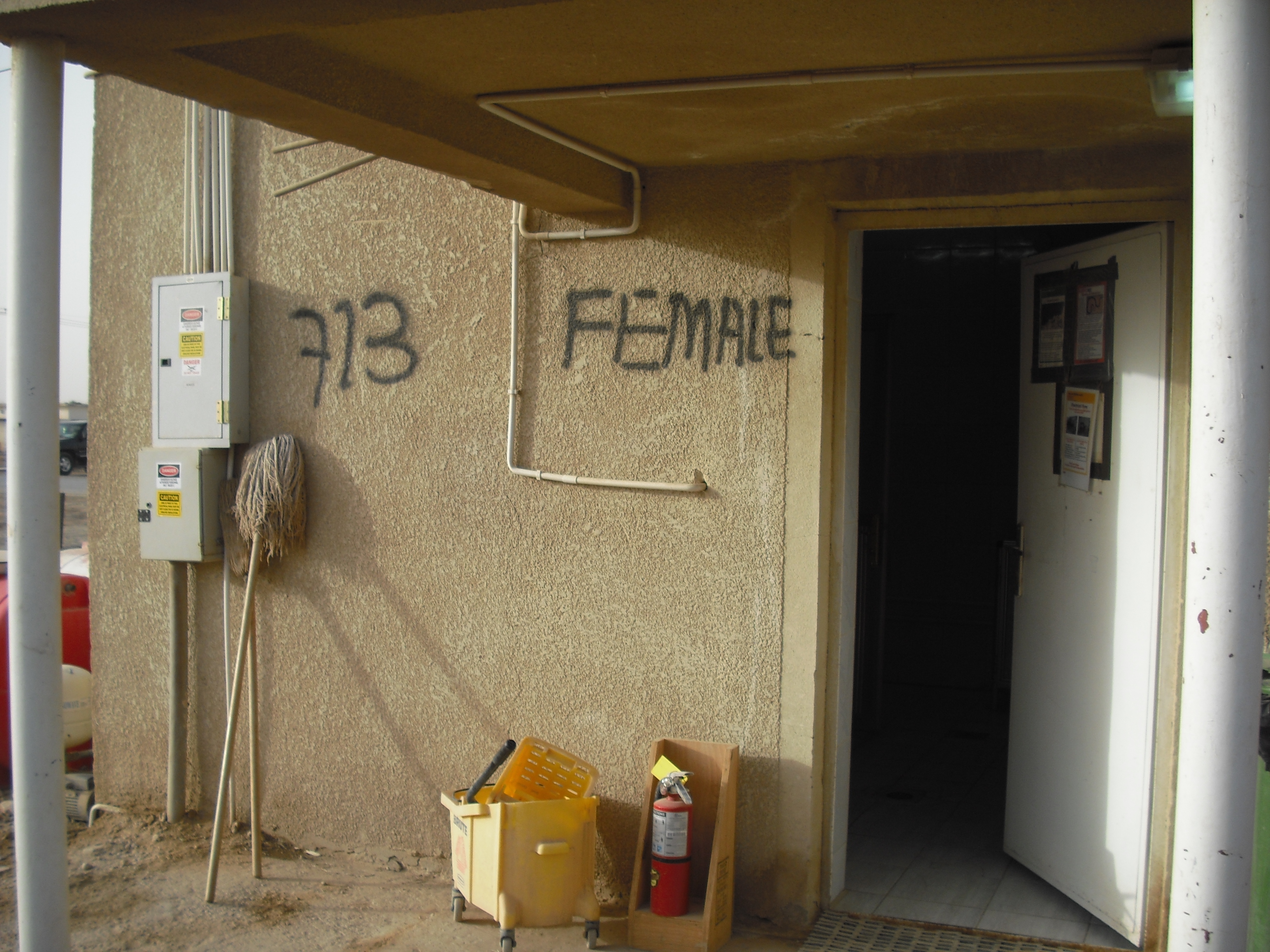 When I arrived in theater, there were unique signs in the female spaces. From my bathroom trailer on Dodge City South to the Morale, Welfare, and Recreation (MWR) gym on Victory Base Complex (VBC) to the small forward operating bases (FOBs) like War Eagle or Tallil. All the signs communicated the same message: have a battle buddy, don’t shower or workout or go to the bathroom by yourself, you’re not safe alone. There were a couple other females with my company in theater when I was, but we did not work the same shifts and rarely went the same places at the same time. I was usually the only girl, so I found these signs unnerving. Maybe men had these signs too; maybe everyone was supposed to have a battle buddy, but that is not how the messaging was conveyed.
