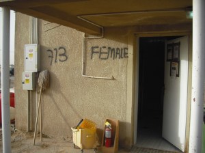 I worked swing shift for the majority of my time in theater, noon to midnight. I had a roommate only for part of my time, but she also worked the day shift, so we overlapped very little. When I got home, it was the middle of the night. I had to trek a quarter mile to the bathroom trailer alone in the dark. Between the doctor’s warning, the stories, and the signs, my paranoia was thick. The trailer pad was covered in rocks and gravel to combat the native mud, so you could hear every footstep. If I ever heard anyone else in the dark, I stopped walking and turned off my light, waiting and hiding in the dark, hoping they would not know I was there and could not see I was female.