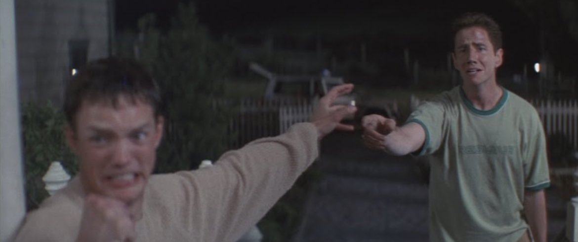 As Stu turned appear as if he was just approaching the scene, Sidney stooped down to snatch the gun from Dewey’s belt. She pointed it at Randy. Randy’s footsteps stuttered as he raised his hands.