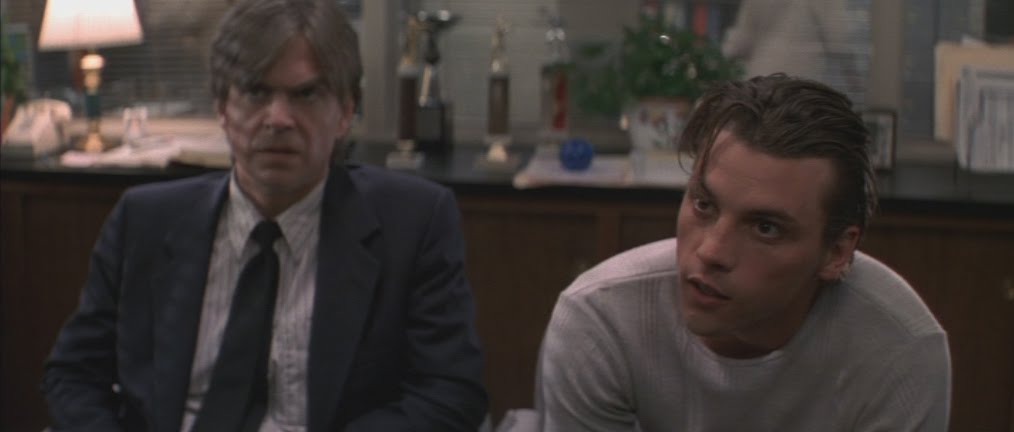 The morning bell split through the sunlight at Woodsboro High. Students loitered over the lawns and sidewalks, meandering into the entrances and clustering into conversation circles. Stu occupied himself by jumping on then off the metal railing climbing along the cement stairs. Billy leaned against the railing, his arms pinned across his stomach as he squinted at the crowd.