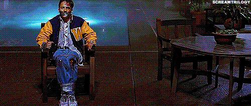 The inspiration charged Stu, and he took long strides to through the door and to Dewey’s body. Seizing the knife theatrically, he tore it from Dewey’s spine, turning his ghostly face directly toward Sidney and wiping the knife off to show her it was her turn. The way her jaw went slack and her eyes glimmered in fear told him it was a great idea.