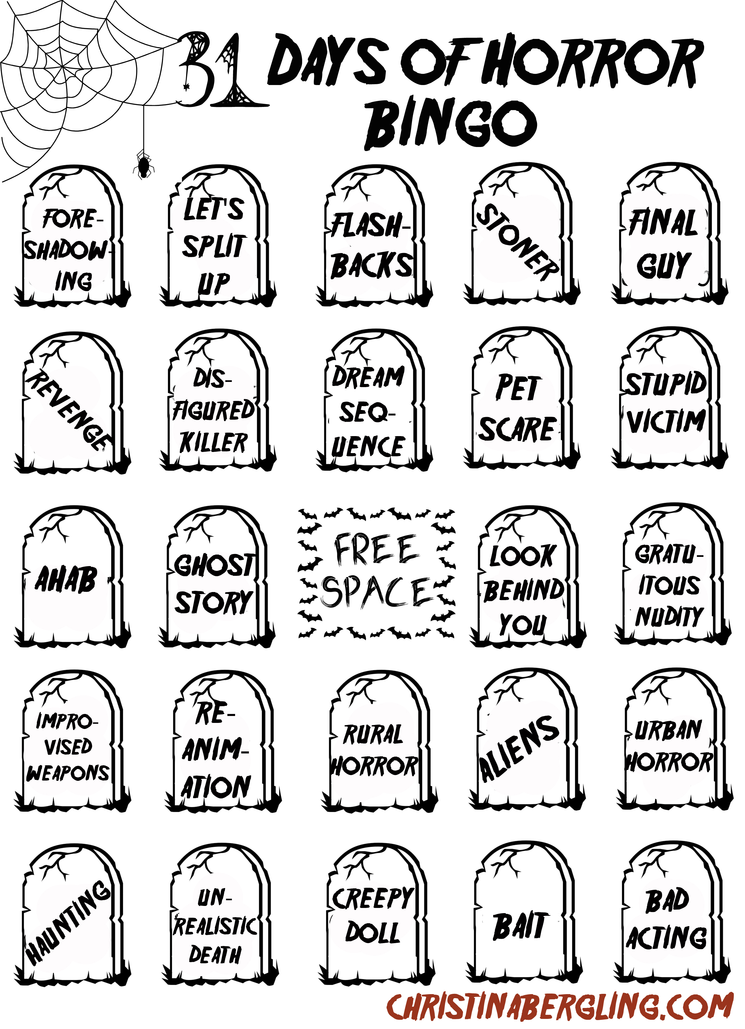 - For each horror movie, mark a tombstone on the bingo board.