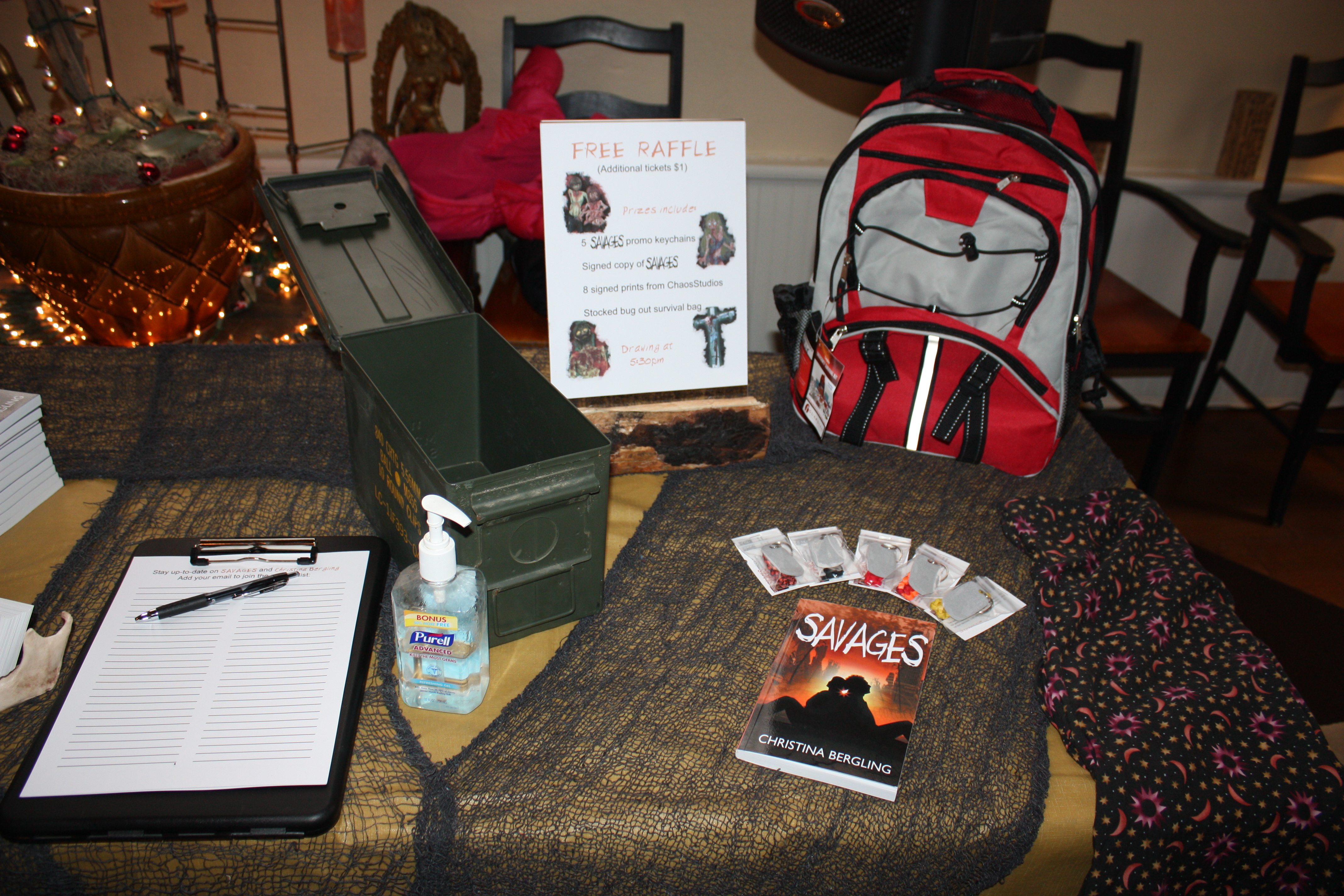Ultimately, much like it was the backdrop for the story itself, I let the apocalypse be my theme. A friend suggested a taproom in an old church for the venue. Though the place was more polished and less professional than I would have preferred, it fit the theme perfectly, and I simply built from there. I set up a table at the venue. I sold and signed copies of my book. I did a raffle for book-related and survival swag. I did it open house style to keep it casual. And finally, under duress, I did a reading from my book.